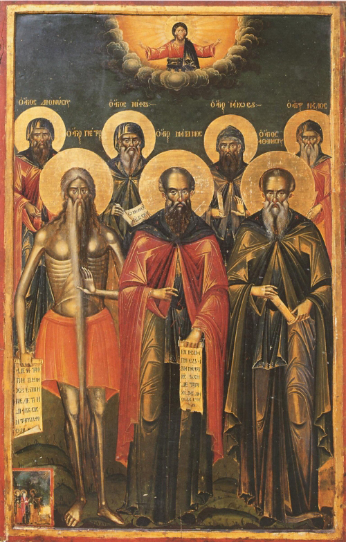 Σύναξις Αγιορειτών Αγίων. Στο κέντρο ο Άγιος Μάξιμος ο Καυσοκαλύβης.