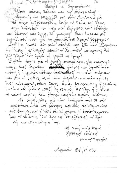 Ένιωσα ιδιαίτερη έκπληξη, χαρά και συγκίνηση όταν πριν από λίγους μήνες, καθώς φυλλομετρούσα στα Γενικά Αρχεία του Κράτους φακέλους με λαογραφικό περιεχόμενο, βρήκα ένα γράμμα του «δασκάλου μας» Απόστολου Γκάτσου. Ο αείμνηστος Πρόεδρος του Ερμιονικού Συνδέσμου το έστελνε στον Γιάννη Βλαχογιάννη με ημερομηνία 21 Αυγούστου 1933, ενώ ήταν φοιτητής Φιλολογίας του Πανεπιστημίου Αθηνών.