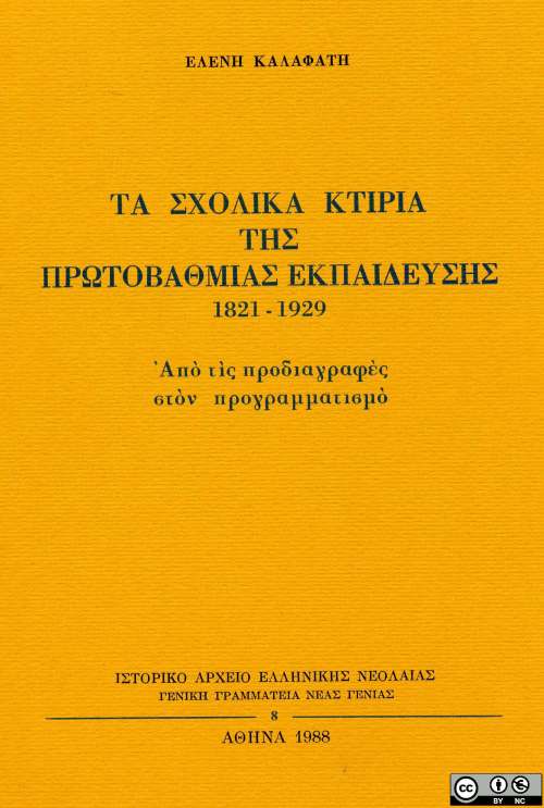 Καλαφάτη Ελένη, «Τα σχολικά κτίρια της πρωτοβάθμιας εκπαίδευσης (1821-1929) – Από τις προδιαγραφές στον προγραμματισμό», Ιστορικό Αρχείο Ελληνικής Νεολαίας – Γενική Γραμματεία Νέας Γενιάς, Αθήνα, 1988. » Τα σχολικά κτίρια της πρωτοβάθμιας εκπαίδευσης (1821-1929)