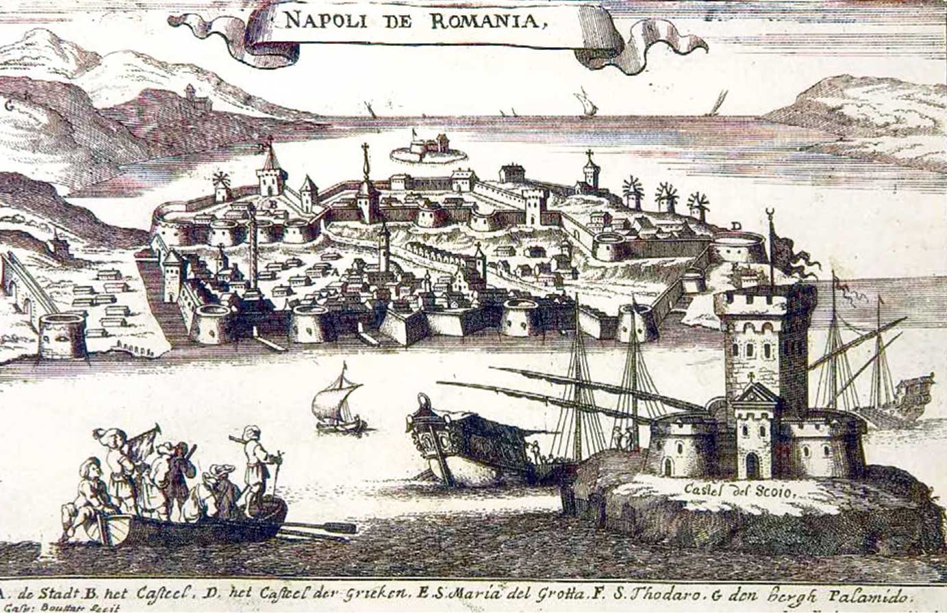 Οι ανεμόμυλοι του Ναυπλίου: J. Peeters, Description…, ca. 1690 (Αφροδίτη Κούρια, Το Ναύπλιο των περιηγητών / The Nauplion of the Foreign Travellers, Εμπο¬ρική Τράπεζα της Ελλάδος Α.Ε., Αθήνα 2007, σ. 60, αρ. 27).