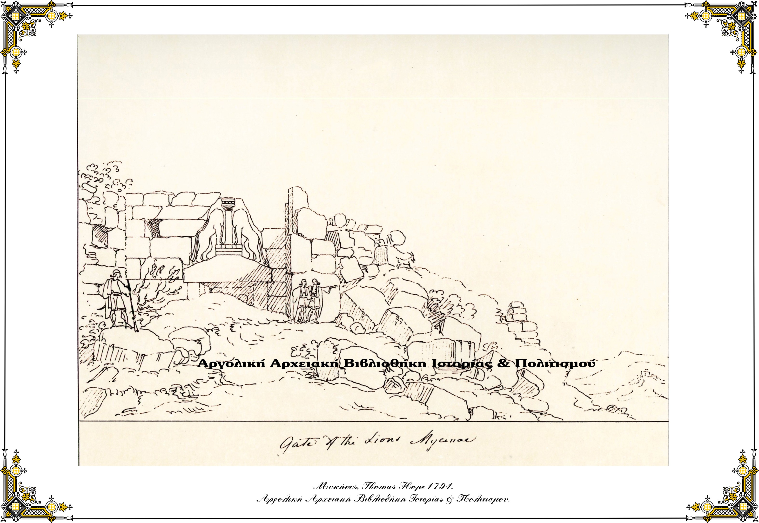 Μυκήνες, ή Πύλη των Λεόντων, Thomas Hope, τέλος 18ου αιώνα. Σχέδιο με σέπια σε χαρτί.