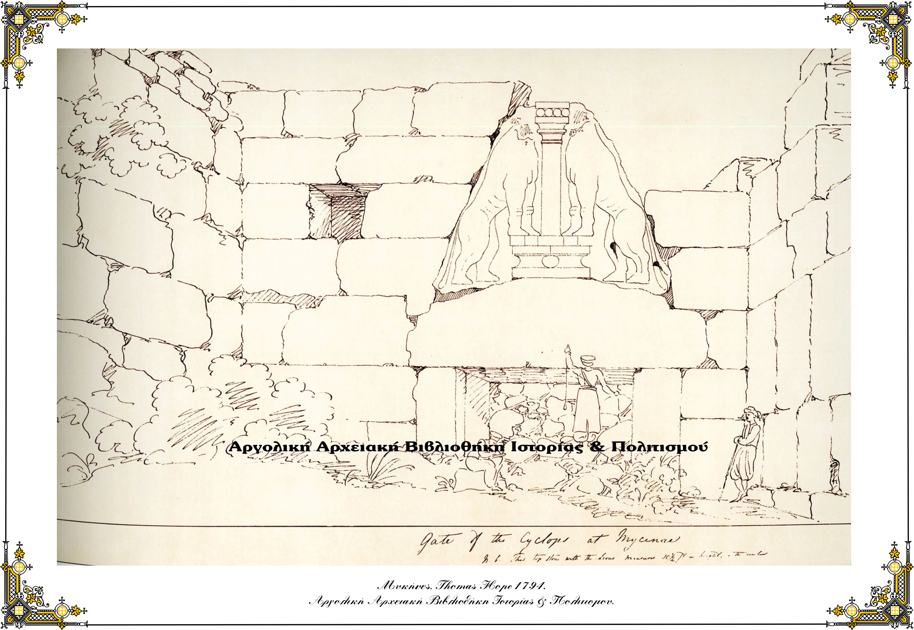 Μυκήνες, ή Πύλη των Λεόντων, Thomas Hope, τέλος 18ου αιώνα. Σχέδιο με σέπια σε χαρτί. Χειρ, σημ.: «Gate of the Cyclops at Mycenae – n.b. the top stone with the Lions measures 10 1/2 ft 5 in height in the center». «Πύλη των Κυκλώπων στις Μυκήνες – ή ανώτατη πέτρα με τούς λέοντες έχει διαστάσεις 10 1/2 πόδια ύψος, στο κέντρο». (Φανή-Μαρία Τσιγκάκου «Thomas Hope…)