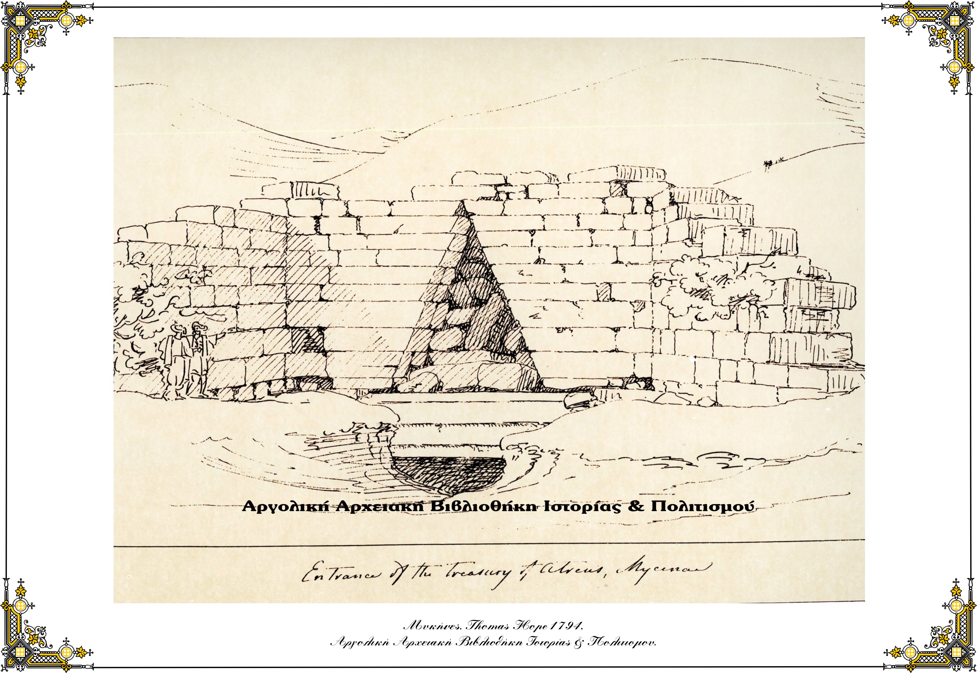 Μυκήνες, τμήμα τής εισόδου του λεγόμενου Τάφου τής Κλυταιμνήστρας – Thomas Hope, τέλος 18ου αιώνα. Σχέδιο με σέπια σε χαρτί. «Entrance of the Treasury of Atreus, Mycenae». «Είσοδος τού Θησαυρού τού Ατρέως, Μυκήνες».