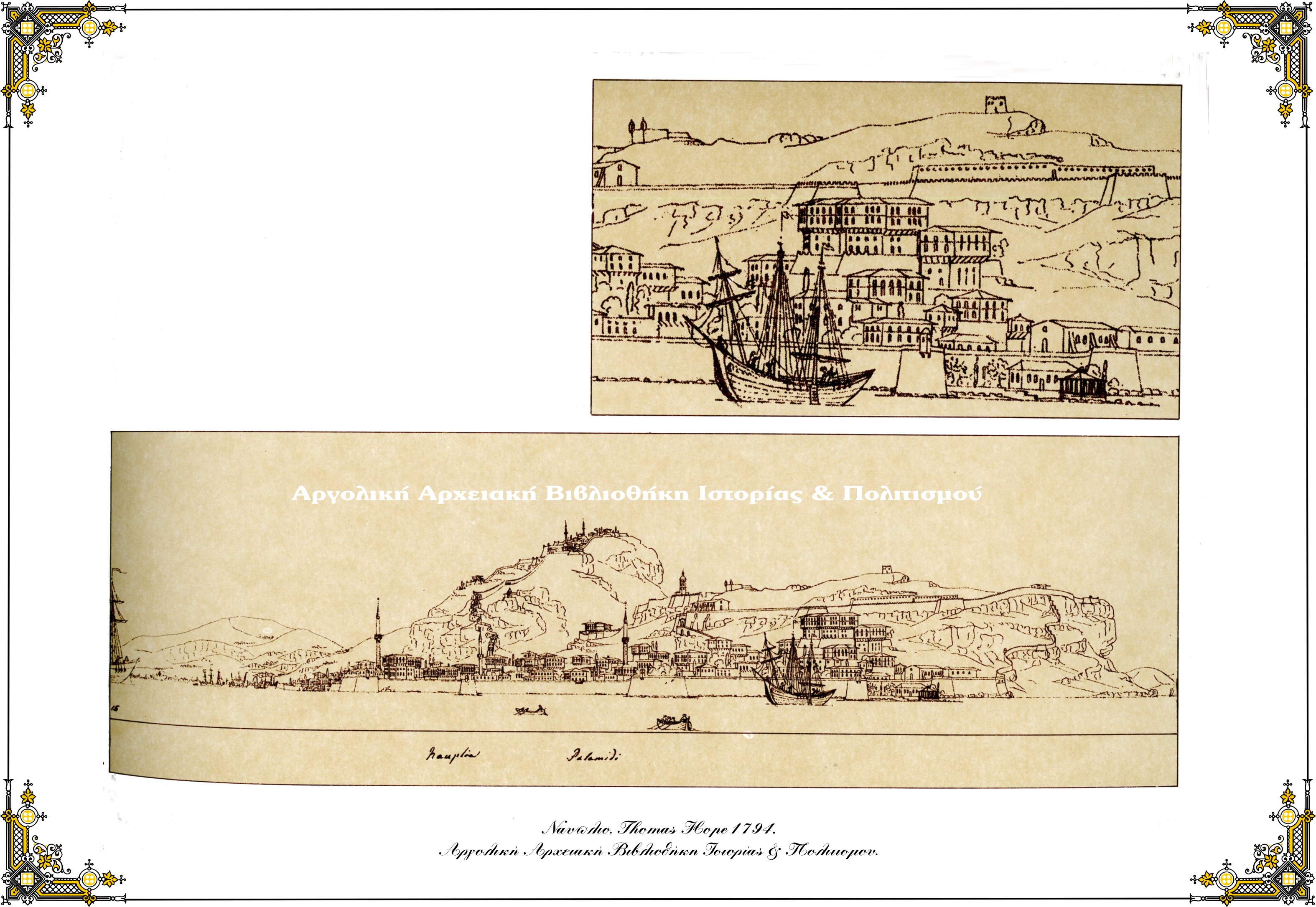 Thomas Hope – Ναύπλιο, γενική άποψη τής πόλης από τη θάλασσα, τέλος 18ου αιώνα. Σχέδιο με μελάνι σε χαρτί. Η άποψη αυτή θα πρέπει να σχεδιάστηκε από το Μπούρτζι, διότι όχι μόνο είναι αρκετά κοντινή, άλλα επιπλέον απεικονίζεται ολόκληρο το αριστερό τμήμα της πόλης το όποιο συνήθως καλύπτει ο όγκος του φρουρίου. Η άποψη αποτελεί μία εξαιρετικής σημασίας οπτική μαρτυρία για το προεπαναστατικό Ναύπλιο, δεδομένου ότι διασώζει παραδοσιακούς αρχιτεκτονικούς τύπους, αποκαλύπτοντας και την παραμικρή λεπτομέρεια.