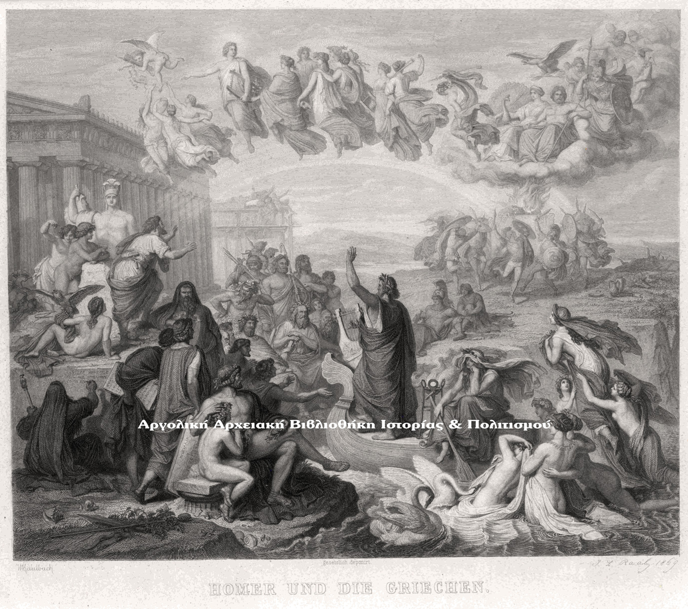 Ο Όμηρος και οι Έλληνες, έργο του Γερμανού ζωγράφου Wilhelm von Kaulbach (1805- 1874). Τοιχογραφία στη σκάλα του νέου μουσείου στο Βερολίνο, έκδοση του Alexander Dunckel, 1871.