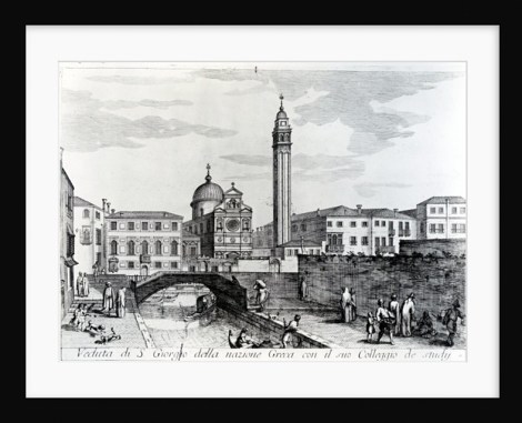 Το Ελληνομουσείο Φλαγγίνη, αριστερά και στο κέντρο, ο Άγιος Γεώργιος των Ελλήνων, συνοικία Καστέλο. Το 1498, η ελληνική κοινότητα της Βενετίας πήρε το δικαίωμα να ιδρύσει τη «Scuola de San Nicolò dei Greci» (Σχολή του Αγίου Νικολάου των Ελλήνων», μια αδελφότητα η οποία βοηθούσε τα μέλη της κοινότητας. Το 1539, μετά από διαρκείς διαπραγματεύσεις, η καθολική εκκλησία επέτρεψε την κατασκευή της εκκλησίας του Αγίου Γεωργίου η οποία χρηματοδοτήθηκε από φόρο σε όλα τα πλοία που ερχόταν από Ορθόδοξες περιοχές. Η Φλαγγίνειος Σχολή, ή Ελληνομουσείο Φλαγγίνη ή Φλαγγιανόν Φροντιστήριον ήταν ελληνικό εκπαιδευτικό ίδρυμα που λειτούργησε στη Βενετία από το 1662 έως το 1905.