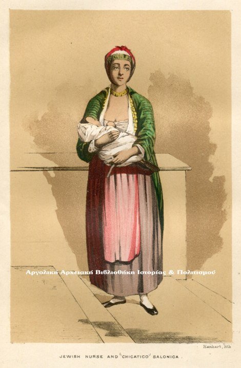 Εβραία τροφός με βρέφος στη Θεσσαλονίκη (Jewish nurse and «chicatico», Salonica), 1864. Έκδοση: Walker, Mary Adelaide. Through Macedonia to the Albanian Lakes, Λονδίνο, Chapman and Hall, 1864.