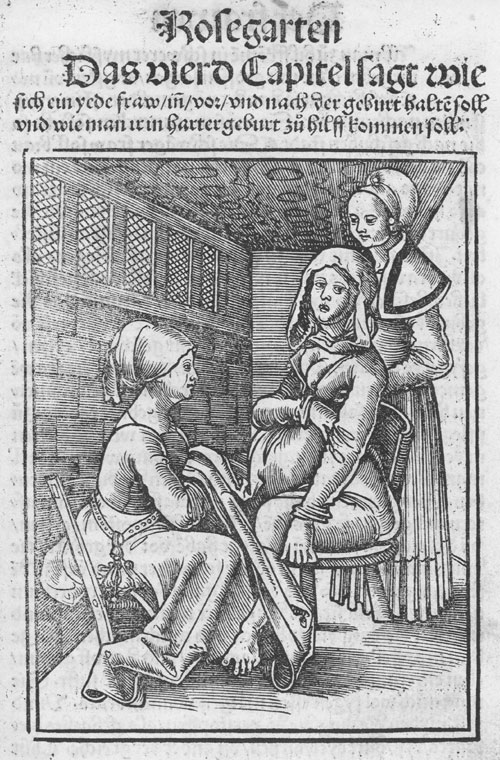 Εξώφυλλο βιβλίου περί γυναικολογίας. Σκηνή τοκετού από το βιβλίο του Roesslin Der Swangern Frawen und Hebammen Rosengarten (1513), που απεικονίζει μια γυναίκα καθισμένη σε καρέκλα να δέχεται τις φροντίδες δύο μαιών.
