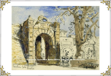 Η ενετική Πύλη του Ναυπλίου (η Πύλη της Ξηράς – εξωτερική όψη), τέλος 19ου αιώνα. Έργο του John Fulleylove (1845-1908), Άγγλου αρχιτέκτονα, ζωγράφου και εικονογράφου ταξιδιωτικών βιβλίων. British Museum.