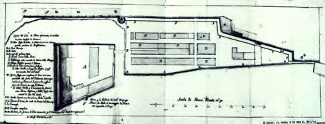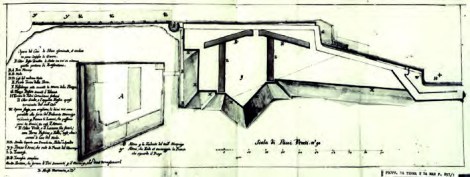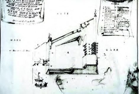 Εικ. 7: Σχεδιάγραμμα του παράλιου τείχους του Ναυπλίου και του αποσπασμένου οχυρού Mocenigo, με την υπάρχουσα τότε κατάσταση (Βενετία, Archivio di Stato, Provveditori da Terra e da Mar, F: 857, disegno 1, collocazione fotographica 14111, foto 361-362).