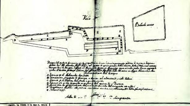 Εικ. 11: Σχεδιάγραμμα του παράλιου τείχους του Ναυπλίου και του απο¬σπασμένου οχυρού Mocenigo, με διαφορετικές προτάσεις βελτίωσης της αμυντικής κατάστασης (Βενετία, Archivio di Stato, Provveditori da Terra e da Mar, F: 857, Disegno 2, collocazione fotografica 14112, foto 363).