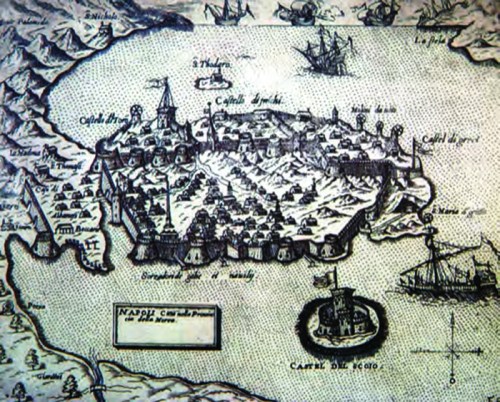 Εικ. 1: Άποψη του Ναυπλίου (G. F. Camocio, Isole famose, porti, fortezze e terre maritime…, Βενετία περ. 1571-1575), χαλκογραφία.