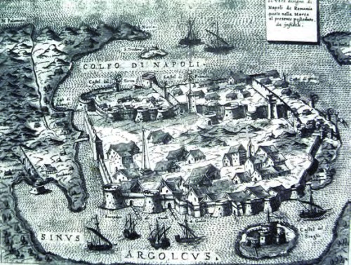 Εικ. 2: Άποψη του Ναυπλίου (S. Pinargenti, Isole che son da Venetia…, Βενετία 1573), χαλκογραφία.