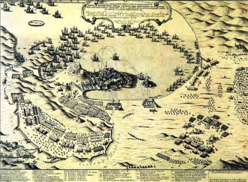 Εικ. 4: G. G. de Rossi, «Σχεδιάγραμμα και προοπτική άποψη της πόλης και του φημισμένου λιμανιού του Ναυπλίου… που πολιορκήθηκαν από το στρατό της Βενετίας και των συμμάχων…» [1687], χαλκογραφία.