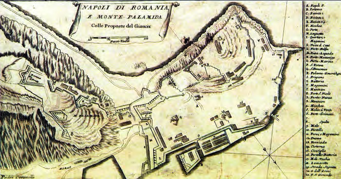 Εικ. 5: V. Coronelli, Σχεδιάγραμμα του Ναυπλίου και του φρουρίου του Παλαμηδιού (από αταύτιστη έκδοση, α΄ μισό 18ου αι.), χαλκογραφία.