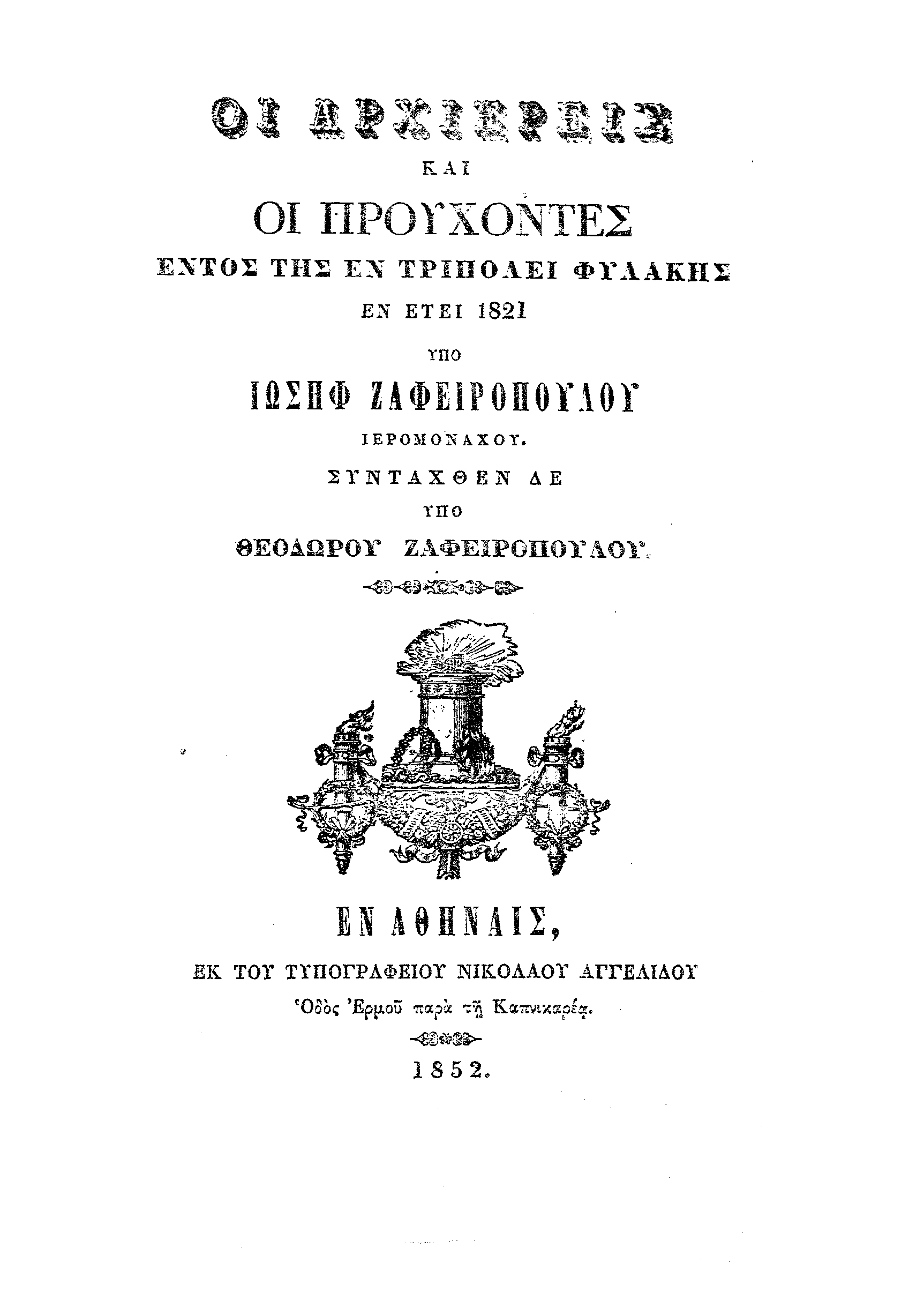 Ιωσήφ Ζαφειρόπουλος, Οι αρχιερείς και οι προύχοντες εντός της εν Τριπόλει φυλακής εν έτει 1821, Εν Αθήναις, 1852. » Ιωσήφ Ζαφειρόπουλος