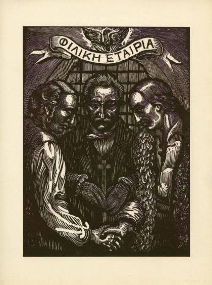 Αθανάσιος Τσακάλωφ, Νικόλαος Σκουφάς, Εμμανουήλ Ξάνθος. Οι ιδρυτές της Φιλικής Εταιρείας. Οδησσός, 1814. Ως ημέρα της ιδρύσεως της Φ. Ε. Καθιερώθηκε η 14η Σεπτεμβρίου. Ξυλογραφία, έργο Βάσου Φαληρέα, 1970. Συλλογή χαρακτικών ΕΙΜ.