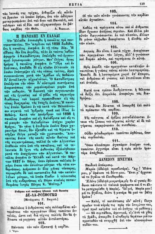 Το άρθρο για την πανώλη, όπως δημοσιεύθηκε στο περιοδικό «ΕΣΤΙΑ», στις 11/03/1879.