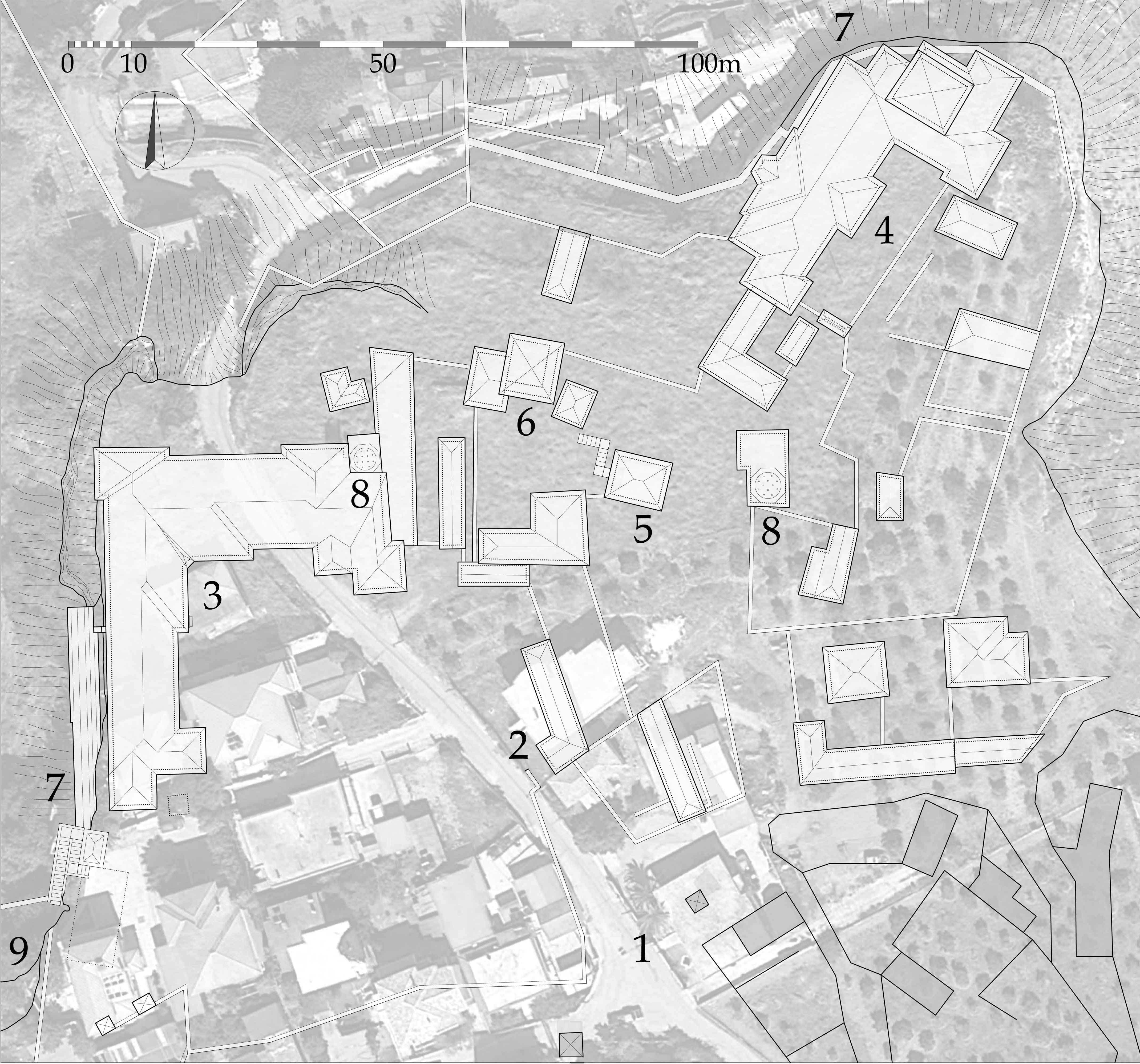 Εικ.4: Γραφική αποκατάσταση του οικοδομικού συγκροτήματος του Μπέη και υπέρθεσή του σε δορυφορική λήψη του 2016. Τα κατάλοιπα των κυριώτερων κτηρίων βρίσκονται θαμμένα σε αδόμητα αγροτεμάχια. 1) Πλατεία μπροστά από το μεγάλο τζαμί του Κάτω Μαχαλά, με δύο μεγάλες κρήνες. 2) Η κύρια πύλη εισόδου. 3) Σελαμλίκι, όπου γινόταν επίσης η υποδοχή των Ευρωπαίων περιηγητών. 4) Χαρέμι, 5) Πύργος με οχυρωματικά χαρακτηριστικά. 6) Πύργος που λειτουργούσε ως μπελβεντέρε. 7) Βενετικές οχυρωματικές κατασκευές. 8) Λουτρά. 9) Λουτρά Αφροδίτης. Κλίμακα 1:2000.