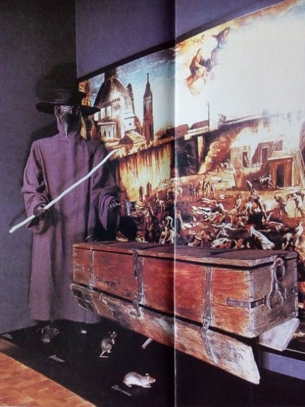 Φέρετρο πολλαπλών χρήσεων για νεκρούς από πανώλη, 17ος αι. Δίπλα ιατρική προφυλακτική φορεσιά του 10ου αι. Από πίσω αντίγραφο της ελαιγραφίας «Ο θρίαμβος του θανάτου». Κάτω από το φέρετρο δύο αρουραίοι. Μουσείο Ιστορίας Ιατρικής Πανεπιστημίου Ζυρίχης.