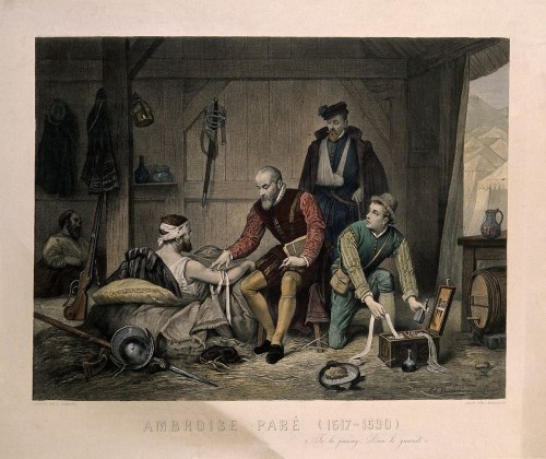 Αμβρόσιος Παρέ (Ambroise Paré, 1510-1590), πατέρας της νεότερης χειρουργικής, ενώ εξετάζει ασθενή.
