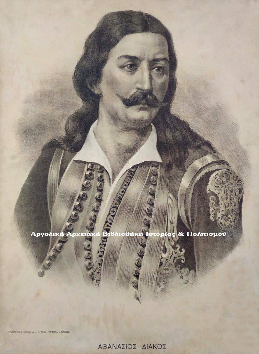 Προσωπογραφία του Αθανασίου Διάκου. Λιθογραφία εκ των παλαιοτέρων εκδοτικών οίκων της Ελλάδος Δ. Π. Δημητράκου.
