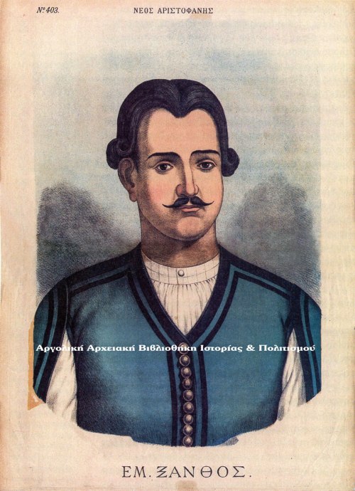 Πορτραίτο του Εμμανουήλ Ξάνθου. Χρωμολιθογραφία από το περιοδικό «Νέος Αριστοφάνης».