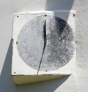 (εικ.1) Στον εξωτερικό νότιο τοίχο του καθολικού τη Μονής Ζωοδόχου Πηγής Πόρου υπάρχει μέχρι και τις μέρες μας το ηλιακό ρολόι που κατασκεύασε ο ηγούμενος της Μονής Γαλακτίων Γαλάτης πριν το ταξίδι του στην Ελβετία, δείγμα του αυτοδίδακτου ταλέντου του.