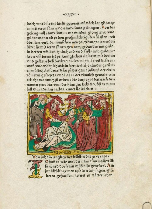 Η πρόωρη γέννα της Πάππισας κατά τη διάρκεια λιτανείας. Trechos do livro «De Mulieribus Claris» («Mulheres Famosas»), de 1362, escrito por Giovanni Boccaccio (1313–1375).