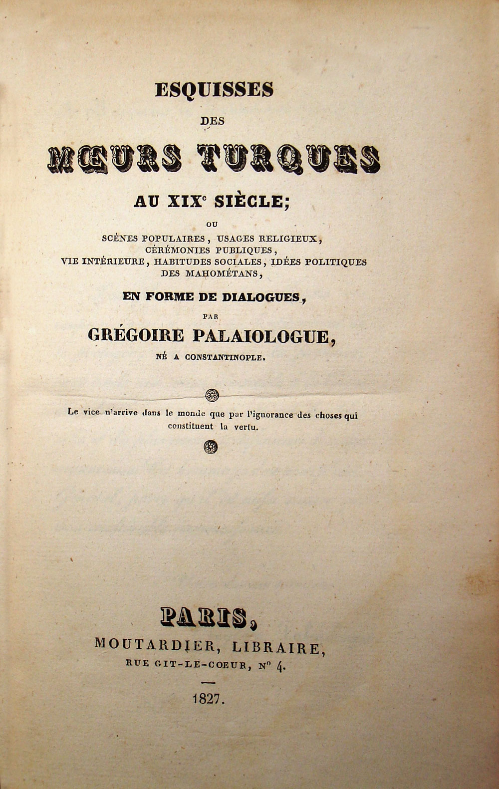 Ένας Κωνσταντινουπολίτης μεταξύ Ανατολής και Δύσης: To «Esquisses de Moeurs Turques aux XIXe siècle» (1827) του Γρηγορίου Παλαιολόγου » Esquisses de Moeurs Turques aux XIXe siècle