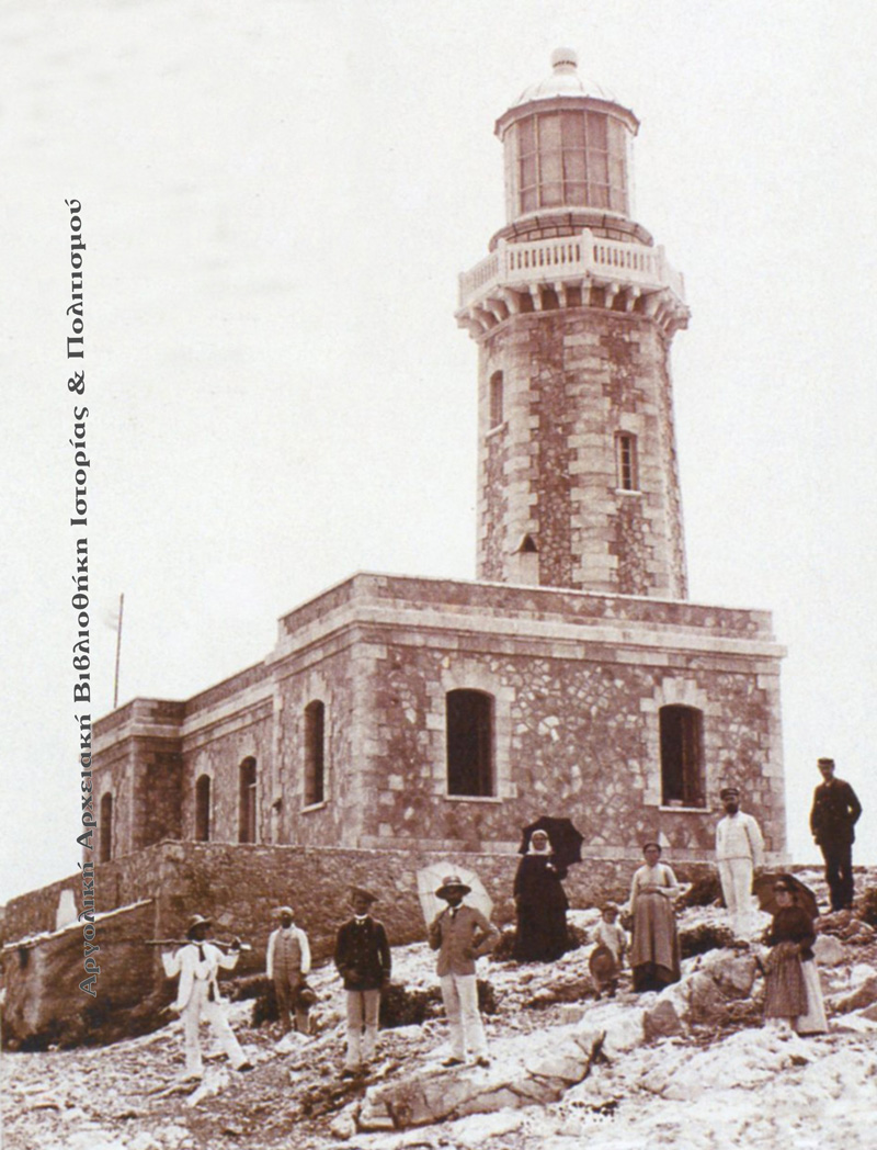 Ο φάρος της Σαπιέντζας, ανοιχτά της Μεθώνης, που ιδρύθηκε το 1885. Εδώ, οι αξιωματικοί του πλοίου ανεφοδιασμού φωτογραφίζονται με τους φαροφύλακες και τις οικογένειές τους. Δημοσιεύεται στο: Λύντια Τρίχα «Χαρίλαος Τρικούπης – Μια Βιογραφική Περιήγηση», εκδόσεις «Καπόν», 2009.