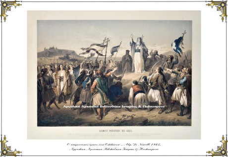 Ο πατριωτικός όρκος των Ελλήνων κατά την έναρξη της Ελληνικής Επανάστασης. Επιζωγραφισμένη λιθογραφία των R. Bettannier και Morton από ομώνυμο ζωγραφικό έργο του Γάλλου ζωγράφου, Alphonse de Neuville. Παρίσι, 1865.