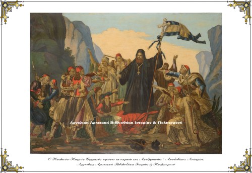 L’ Arcivescovo Germanòs pianta lo stendardo della croce sulle rupi di Calavrita il 25. 3. 1821 (Venice, Lit. Kirchmayr, mid-19th century).