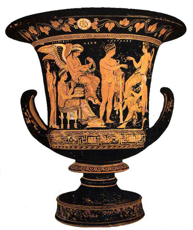 Ηρακλής, Δηιάνειρα, Οινέας, Αχελώος. Ερυθρόμορφος σικελικός καλυκωτός κρατήρας, περίπου μέσα 4ου αι. π.Χ. Αριστερά κάθεται η Δηιάνειρα κρατώντας τρεις φιάλες. Πίσω της στέκεται η θεραπαινίδα. Στο κέντρο ο Ηρακλής είναι στραμμένος προς τον Οινέα, τον πατέρα της Δηιάνειρας. Πάνω του εικονίζεται ο ποτάμιος θεός Αχελώος. Η Νίκη με το στεφάνι υποδηλώνει τη νίκη του Ηρακλή στη διεκδίκηση της Δηιάνειρας. Lipari, Museo Archeologico Eoliano.