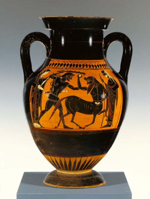 Ο Ηρακλής μάχεται με τον Νέσσο. Αττικός μελανόμορφος αμφορέας της Ομάδας της Μήδειας, περίπου 530-520 π.Χ. Αριστερά η γυναικεία μορφή ταυτίζεται με τη Δηιάνειρα και δεξιά η ανδρική με τον Οινέα. The J. Paul Getty Museum.