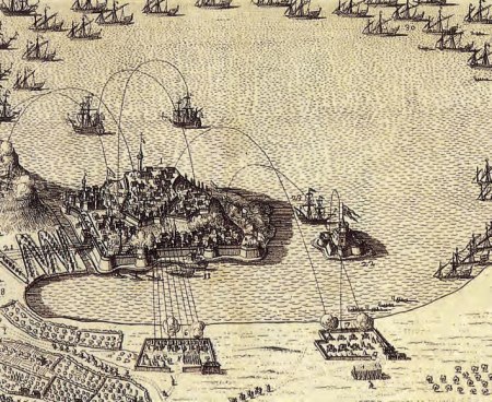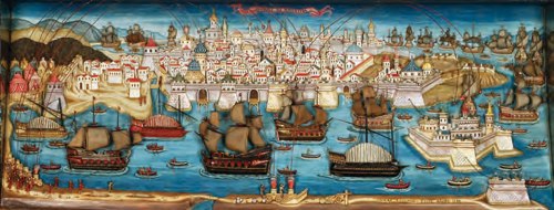 Τέλος, ο ζωγράφος πρόσθεσε, καλλιτεχνική αδεία, διάφορα πλοία μέσα στο λιμάνι, που φαίνεται να είναι χριστιανικά (εικ. 1), και διαχώρισε τις χριστιανικές από τις οθωμανικές δυνάμεις «ντύνοντας» τους χριστιανούς στα κόκκινα (εικ. 9) και τους Οθωμανούς στα γαλάζια (εικ. 10).