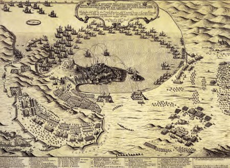 Εικ. 5: Σχεδιάγραμμα και προοπτική άποψη της πόλης και του λιμανιού του Ναυπλίου. Αποτύπωση των στρατιωτικών δυνάμεων Βενετών και Οθωμανών. Χαλκογραφία του Gio. Giacomo de Rossi, 1687.