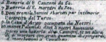 Εικ. 6: Λεπτομέρεια από την εικόνα 5. Αποτυπώνεται η θέση των πυροβολαρχιών και καταγράφεται όχι μόνο ο αριθμός των κανονιών και των μορταρίων αλλά και η δύναμη πυρός που έχουν.