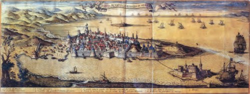 Εικ. 4: Άποψη της πόλης του Ναυπλίου και της γύρω περιοχής. Επιχρωματισμένη χαλκογραφία του 1687 που αποδίδεται στον Gio. Giacomo de Rossi.