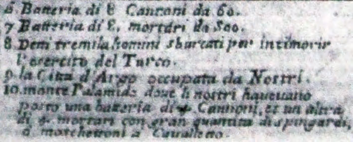 Η πολιορκία του Ναυπλίου το 1686 κατά Thomas Gaudiello (1688) » Εικ. 6: Λεπτομέρεια από την εικόνα 5. Αποτυπώνεται η θέση των πυροβολαρχιών και καταγράφεται όχι μόνο ο αριθμός των κανονιών και των μορταρίων αλλά και η δύναμη πυρός που έχουν.