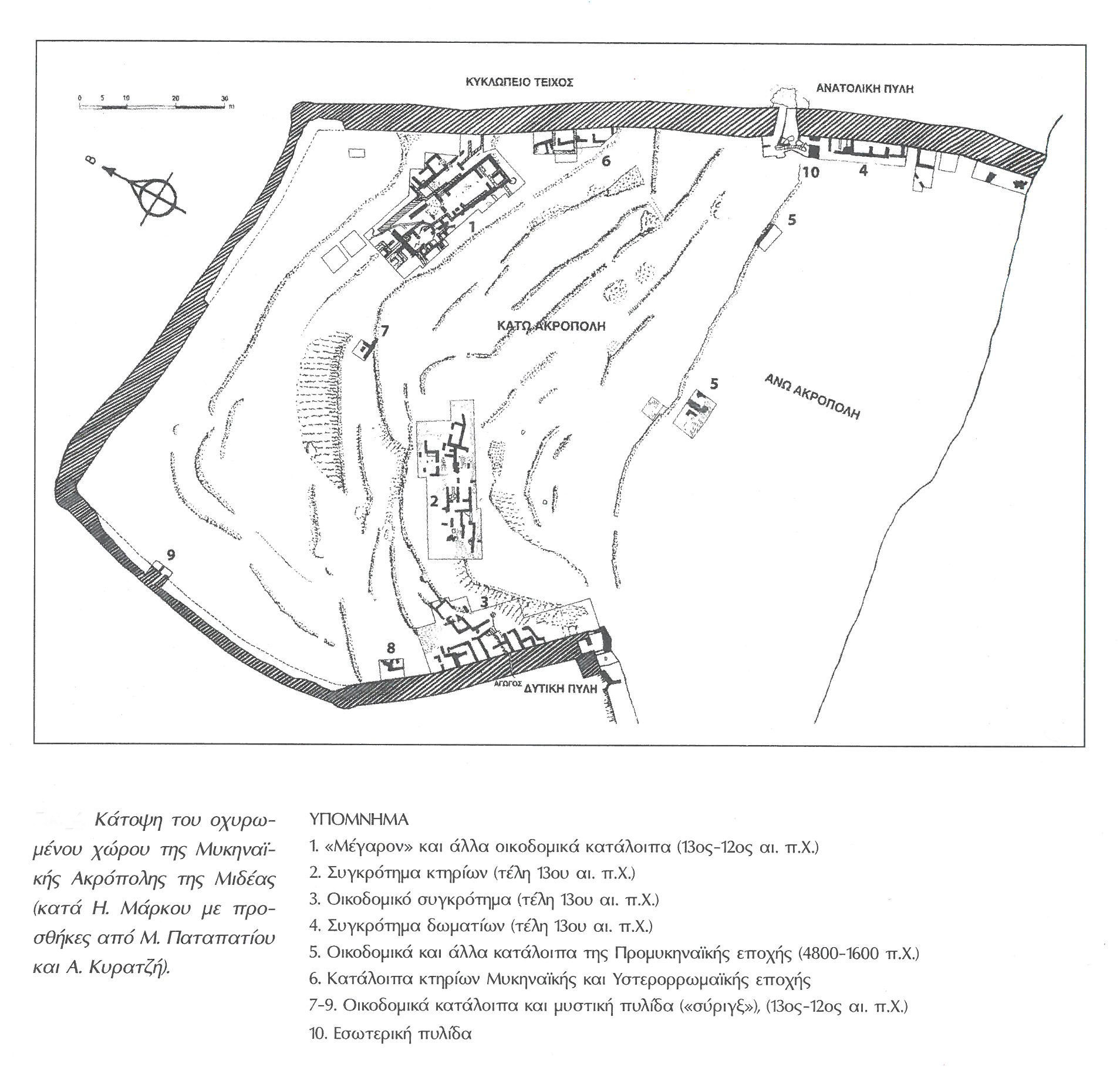 Κάτοψη του οχυρωμένου χώρου της Μυκηναϊκής Ακρόπολης της Μιδέας (κατά Η. Μάρκου με προσθήκες από Μ. Παπαπατίου και Α. Κυρατζή). Δημοσιεύεται στο: Καίτη Δημακοπούλου – Νικολέττα Διβάρη-Βαλάκου, «Η μυκηναϊκή Ακρόπολη της Μιδέας». Έτος έκδοσης 2010.