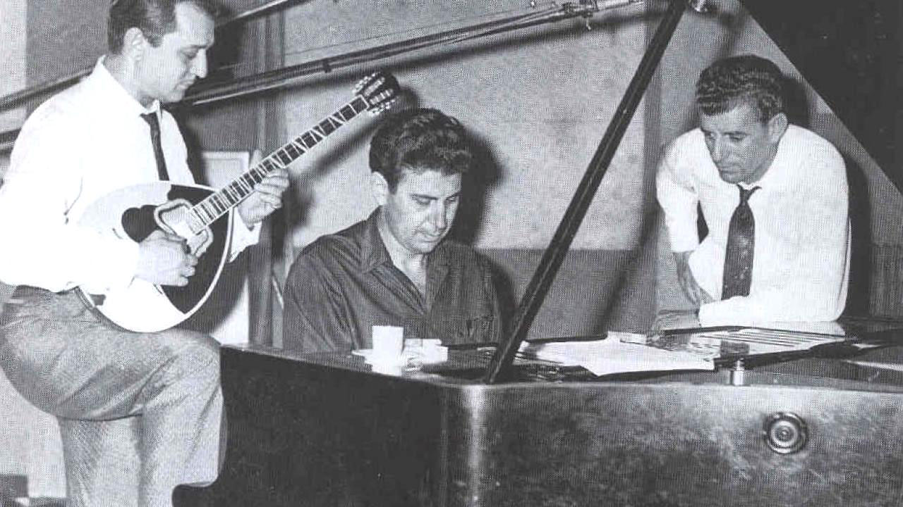 Ο Μανώλης Χιώτης, ο Μίκης Θεοδωράκης και ο Γρηγόρης Μπιθικώτσης στην ηχογράφηση του Επιτάφιου. Πηγή: Lifo.