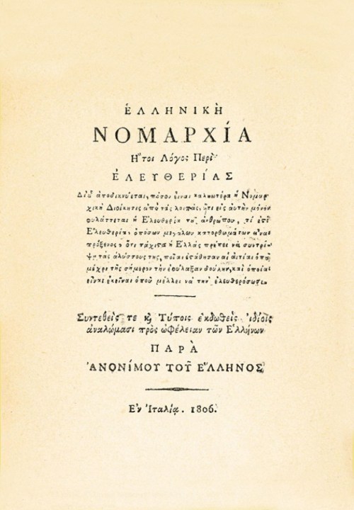 Η «Ελληνική Νομαρχία» κυκλοφόρησε το 1806 στην Ιταλία από άγνωστο συγγραφέα. Καλούσε τους Έλληνες να εξεγερθούν κατά των Οθωμανών, προκειμένου να αποκαταστήσουν τη «νομαρχία», ένα πολίτευμα δηλαδή στο οποίο θα άρχουν οι νόμοι και όχι η αυθαιρεσία. Ταυτόχρονα σκιαγραφούσε την προεπαναστατική ελληνική κοινωνία και κατήγγελλε με ιδιαίτερη δριμύτητα όσους θεωρούσε υπεύθυνους για την αθλιότητα στην οποία είχε περιέλθει: τους προεστούς, τους Φαναριώτες και τους ιεράρχες.