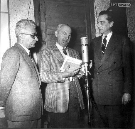 Ο ηθοποιός Νίκος Παρασκευάς (κέντρο) διαβάζει το μυθιστόρημα του Ηλία Βενέζη (αριστερά) «Γαλήνη», στην εκπομπή «Τα αριστουργήματα της λογοτεχνίας μας». Στα δεξιά ο δοκιμιογράφος Ντίμης Αποστολόπουλος, 19, Φεβρουαρίου 1954. Αρχείο ΕΡΤ.
