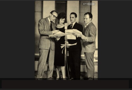 Οι ηθοποιοί Μάνος Κατράκης, Αλέκα Κατσέλη, Νίκος Χατζίσκος και Γιάννης Αργύρης σε ραδιοθάλαμο του Ζαππείου για την εκπομπή «το θέατρο της Τετάρτης», 1960. Αρχείο ΕΡΤ.