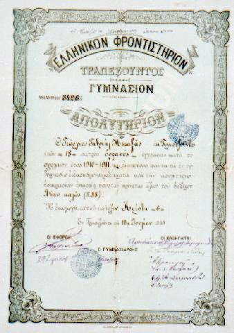 Η πολιτισμική γενοκτονία του ελληνισμού του Πόντου 1908-1923: μία άλλη πτυχή του διωγμού των Ελλήνων » Απολυτήριο Γυμνασίου του Φροντιστηρίου Τραπεζούντας