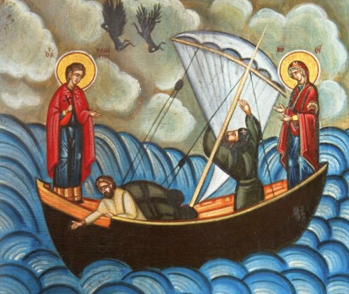 Σκηνή από θαύμα του Αγίου, «Ο άγιος Φανούριος και η Παναγία αποτρέπουν ναυάγιο», λεπτομέρεια της παραπάνω τοιχογραφίας.