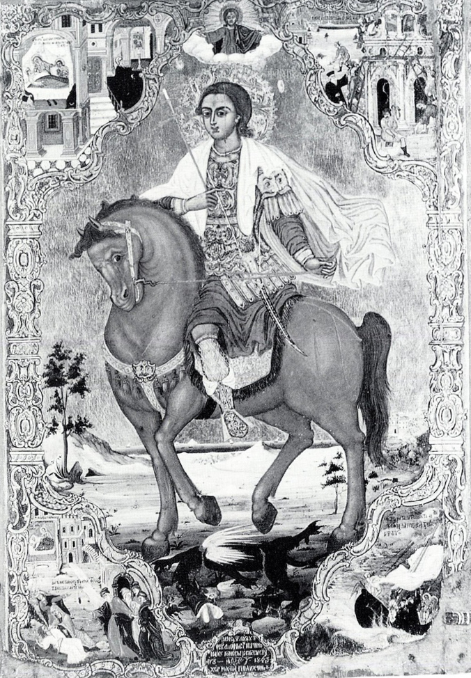 Εικ. 5. Φορητή εικόνα του αγίου Φανουρίου εφίππου με σκηνές του βίου του. Κρήτη, Μονή Οδηγήτριας, (από: Εικόνες της κρητικής τέχνης. Από τον Χάνδακα ως τη Μόσχα και την Αγία Πετρούπολη [1993]).
