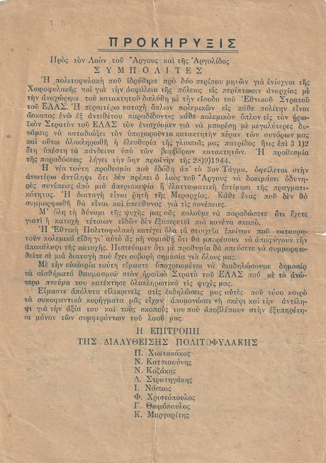«Προκήρυξη προς το λαό του Άργους και της Αργολίδας για την παράδοση μέχρι 28 Σεπτεμβρίου 1944, στον Ελληνικό Λαϊκό Απελευθερωτικό Στρατό (ΕΛΑΣ), των πολεμικών όπλων που κατέχουν, από την επιτροπή τη διαλυθείσης Πολιτοφυλακής Άργους».