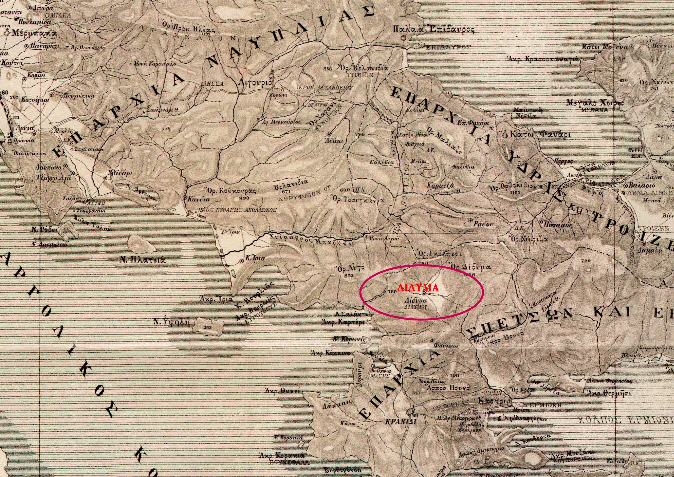 Δίδυμα Αργολίδας » Τμήμα χάρτη της Αργολιδοκορινθίας του Αντώνη Μηλιαράκη, 1886.